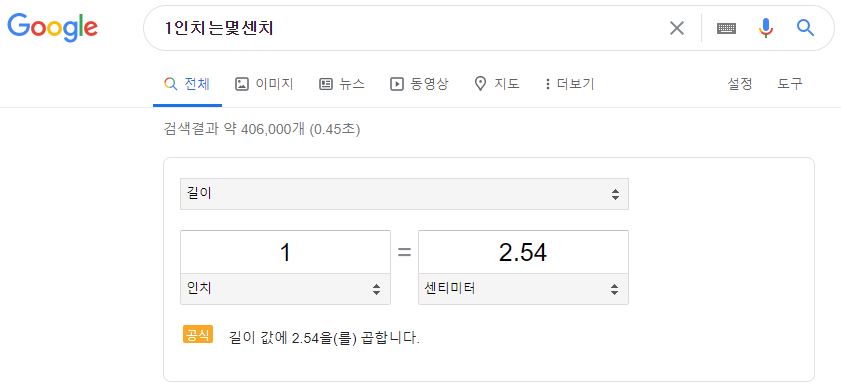 요새는 이런 식으로 구글 검색만으로도 1인치가몇센치 인지 알 수가 있습니다. 1인치는 바로